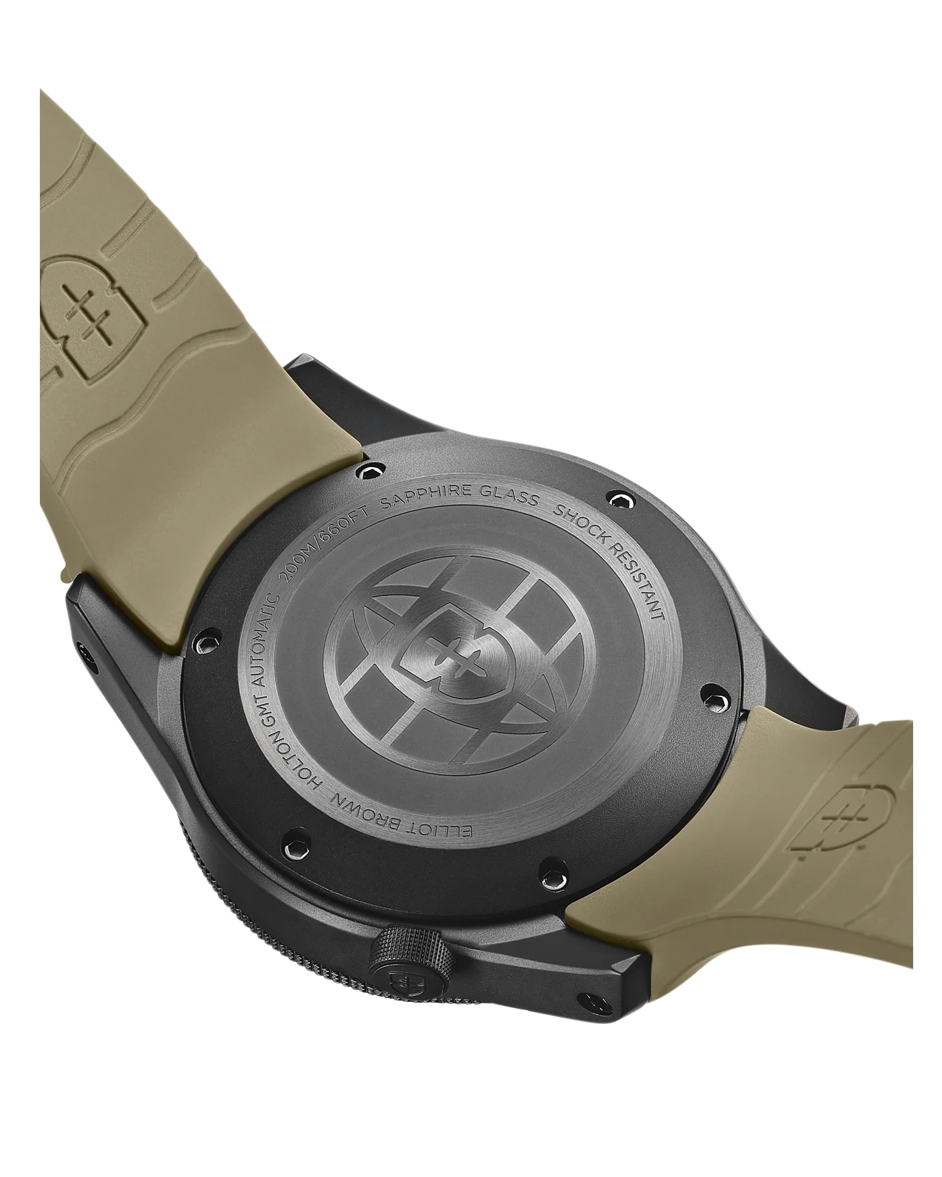 Very minor internal tweaks to our proven shock proofed Holton case mean the GMT version is no thicker than the NH35 automatic version at 14mm, but never being ones to miss an opportunity for some design work, we designed a beautiful new deep etched and brushed case back graphic with an EB shield/globe logo, referencing the GMT movement whilst differentiating it from the other Holton models.