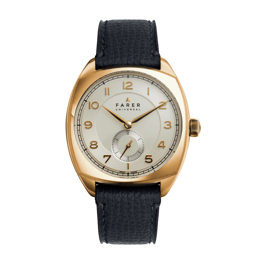 Hand-wound cushion case watch with champagne sector dial and choice of strap.