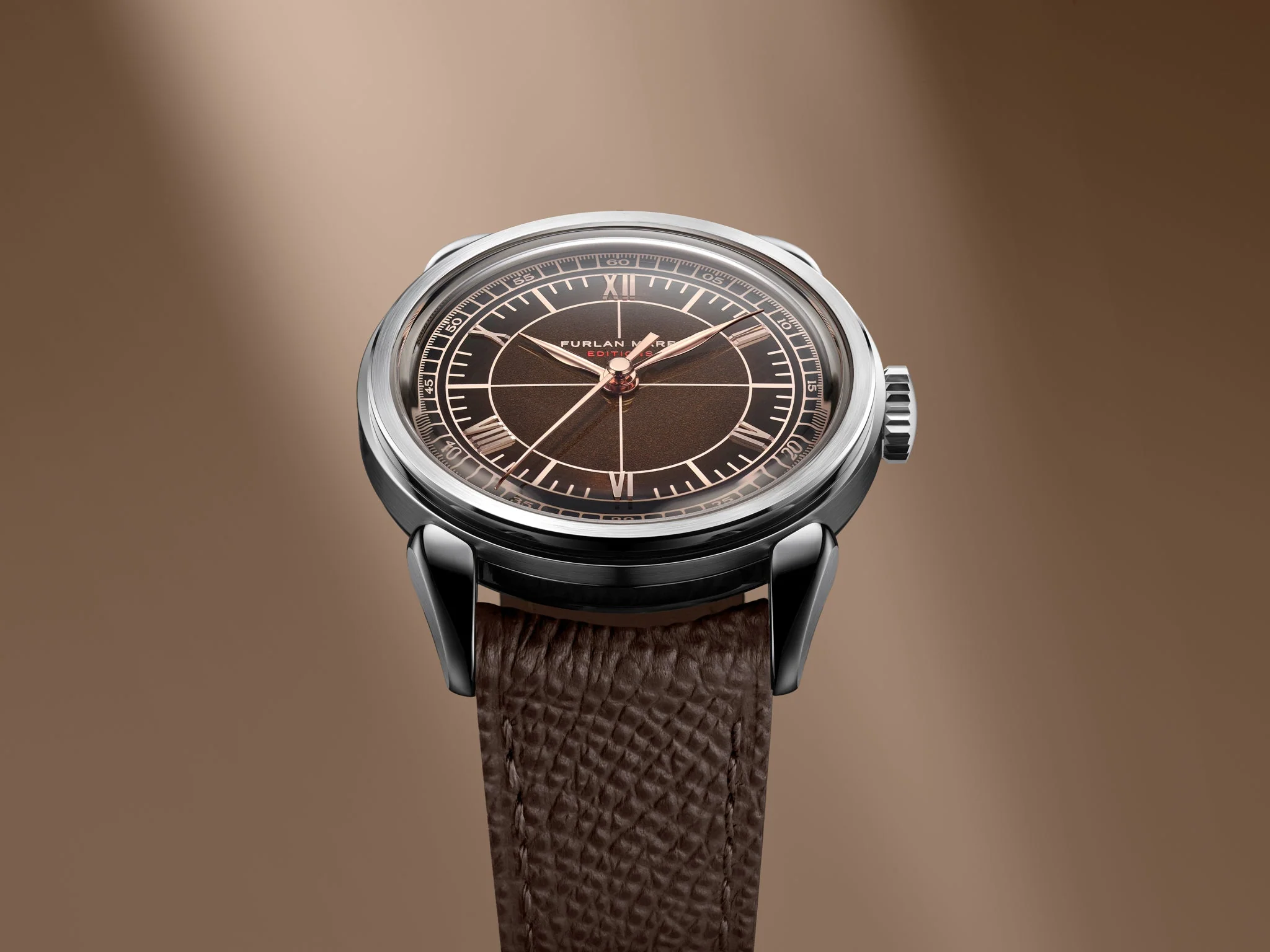 A notable layout change from the regular Furlan Marri Mechanical models are the Roman numerals that replace the Breguet Arabics. Not only do they dress up the watch a tad, but also contribute to the geometric nature of the sector dial itself. We’ve also done away with the reference indication in the lower right corner – an unsurprising choice considering many of us normally scoff at most forms of dial text.