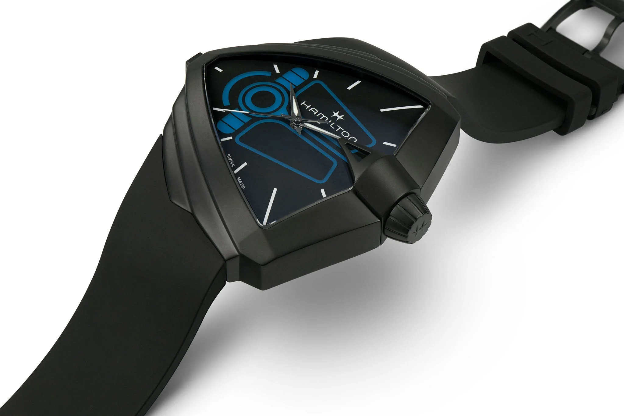 Many Hamilton fans would be familiar with the Ventura XXL Bright. It's recognisable case-shape and handset are synonymous with the famous Ventura collection. This model takes it a step further incorporating a blue LED display which is activated by the press of a button on the mid case.